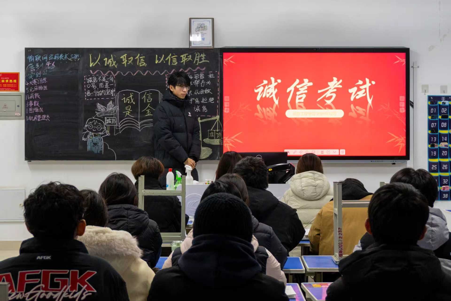 为引导同学们端正考试态度,增强严守考试纪律的自觉性,营造公平公正的考试氛围,保障期末考试平稳有序进行,1月5日,信息工程学院组织开展“诚信考试”教育活动。活动中,各班辅导员老师和学生干部借助多媒体、板报等形式,围绕“诚信考试的意义”“考试作弊的危害”等方面展开宣讲。辅导员老师提醒同学们,备考期间要牢记诚信为本,严守考场规则,尊重他人劳动成果。同时,鼓励同学们端正心态,平衡复习节奏与身心状态,扎实巩固知识要点,以真实成绩彰显学习成效与个人品德。同学们表示,将严格遵守考场纪律,以诚信自律的态度迎接即将到来的考试。本次教育活动的顺利开展,进一步强化了同学们的诚信应考意识,激发了同学们涵养诚信品质的责任担当,推动诚信文化在校园落地生根。信息工程学院将继续坚守立德树人初心,创新教育形式,引导同学们从诚信品质中汲取精神力量,为锤炼优良学风、培育德才兼备的时代新人赋能蓄力。(张斌 赵兰梅供稿)