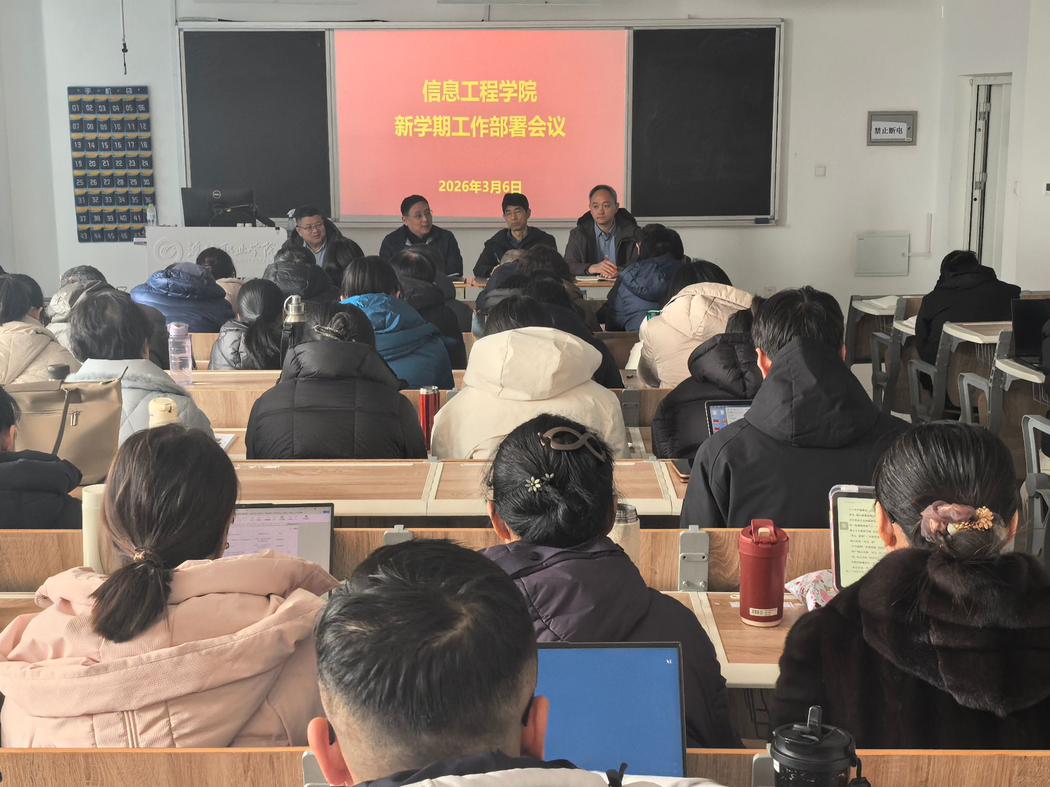 3月6日上午,信息工程学院在滨海校区智泽1号楼A216召开新学期工作部署会议,会议深入贯彻落实学院2026年全院工作动员大会精神,全面部署新学期重点工作,全体教职工参加会议。